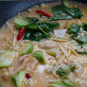 2.นำผักที่สุกยากใส่ลงไป ฟักทอง บวบเหลี่ยม และข้าวโพดอ่อน