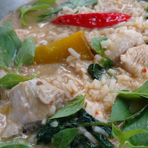 6.เมื่อผักในข้าวสุกดี ใส่พริกแกงที่ผัดไว้มาใส่ลงในหม้อ